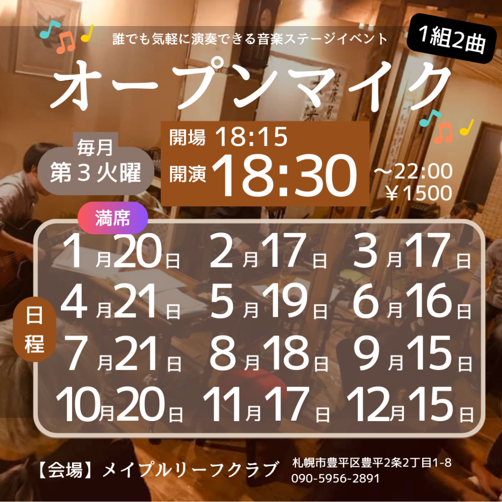 出演希望の方は「お名前/人数(ソロ・ユニット)/楽器/だいたいの到着時間」を送ってもらえると案内がスムーズです。